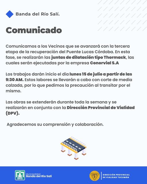 Desde este lunes 15 de julio habrá que transitar con paciencia en el puente Lucas Córdoba ya que habrá una restricción de media calzada en el tránsito. Esto se debe a que iniciarán las tareas de reparación de las grietas que han aparecido en la calzada recientemente colocada.