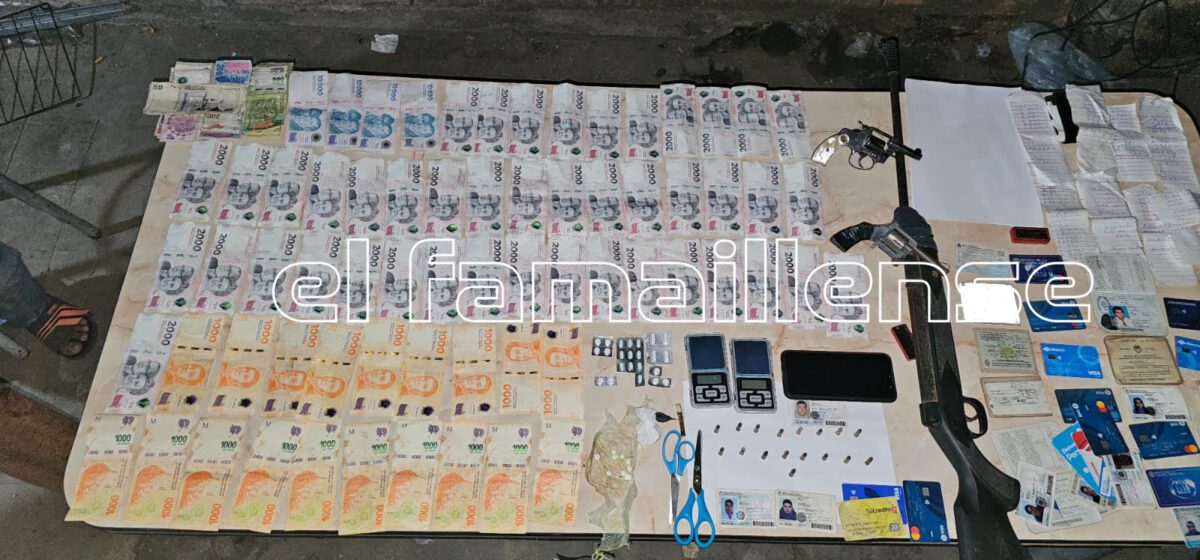 Durante la requisa se secuestraron dos revólveres operativos, un rifle de aire comprimido, más de 10 gramos de cocaína fraccionada, pastillas de ansiolíticos, dos balanzas de precisión, $150.000 en efectivo, una credencial policial, tarjetas varias, documentos de identidad, anotaciones relacionadas con el narcomenudeo y una motocicleta con pedido de secuestro por un robo ocurrido en Bella Vista el 2 de abril.