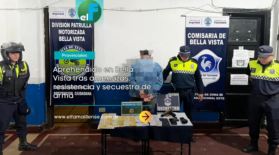 Un hombre de 53 años fue aprehendido en un procedimiento realizado por personal de la Comisaría de Bella Vista y la División Patrulla Motorizada, luego de protagonizar un violento episodio que derivó en el secuestro de un arma de fuego, dinero en efectivo y otros elementos.