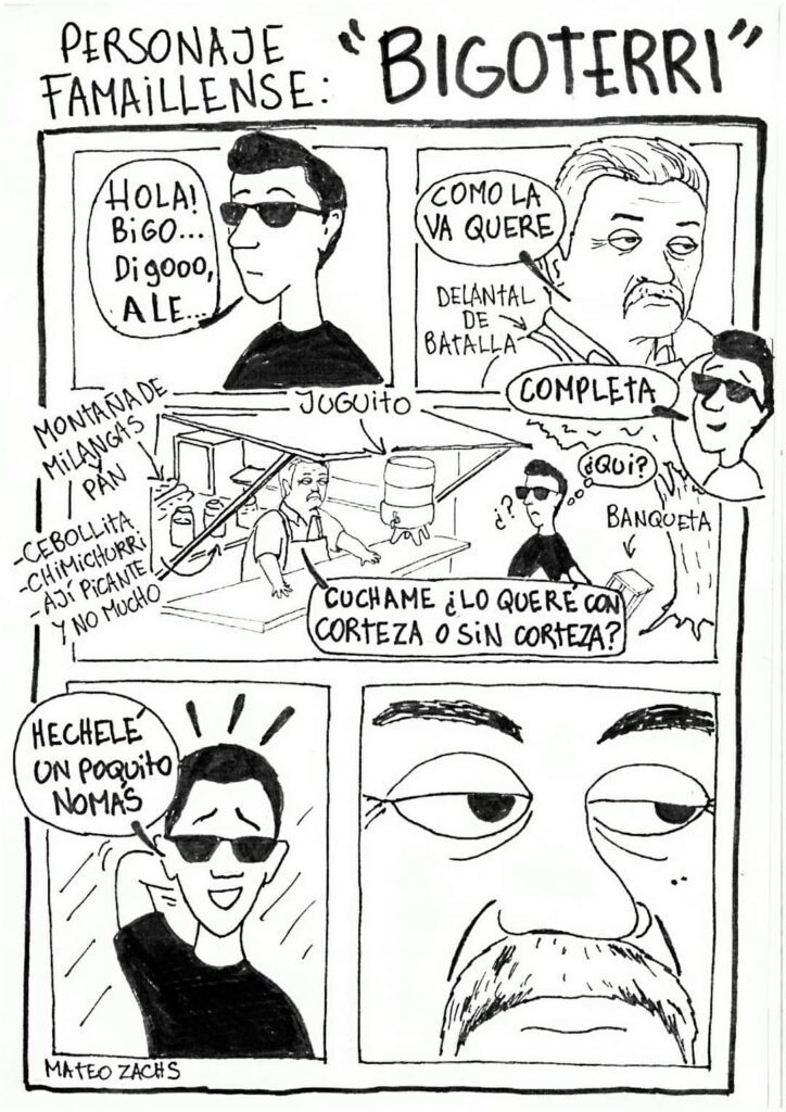 En esta viñeta, Zachs recoge una experiencia personal y al mismo tiempo compartida por muchos de los clientes de Alejandro eandro (su verdadero nombre aunque era más conocido como Ale) en la que lo retrata en el oficio que lo hizo reconocido en Famaillá, vendiendo sándwiches de milanesa acompañado de su tradicional juguito.