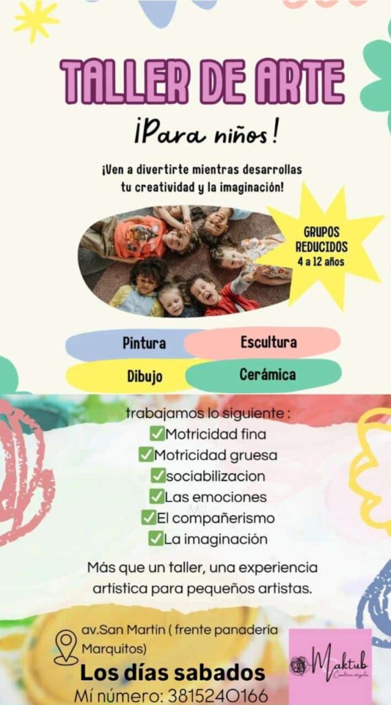 Los talleres se dictan todos los sábados en Av San Martín 567 , para mayor información puedes comunicarte al 3815240166