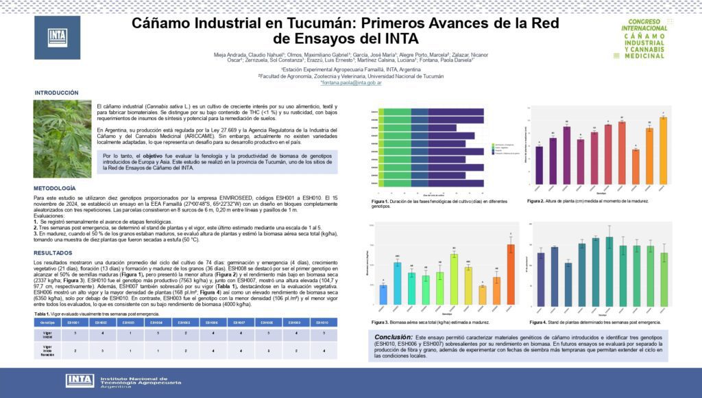 En el marco de la Red de Ensayos de Cáñamo Industrial del INTA, investigadores de la Estación Experimental Agropecuaria (EEA) Famaillá presentaron los primeros resultados de un estudio que busca adaptar y evaluar genotipos de Cannabis sativa L. para uso industrial en Tucumán. Esta planta, conocida comúnmente como cáñamo, tiene bajo contenido de THC (menos del 1 %) y múltiples aplicaciones: alimenticias, textiles, farmacéuticas y para bioconstrucción.
