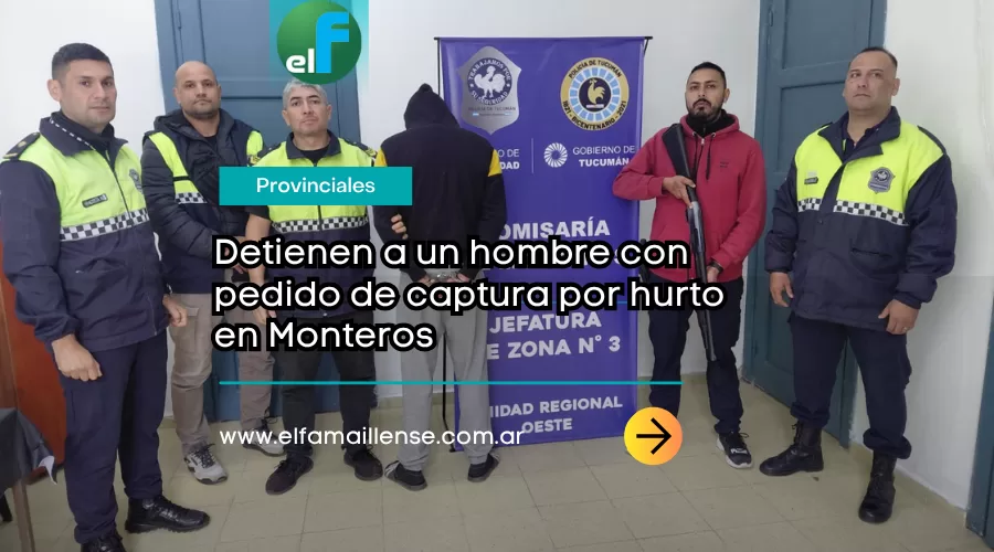 Un sujeto de 30 años fue detenido durante la mañana de este martes en la ciudad de Monteros, en el marco de una causa por hurto simple. El procedimiento fue llevado adelante por personal del área investigativa de la comisaría local, tras tareas de seguimiento y localización.