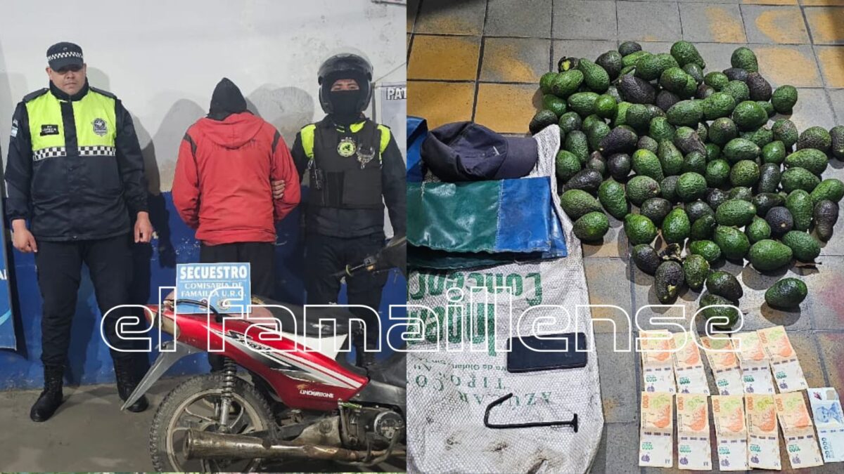En el procedimiento se secuestró una bolsa con 100 paltas, dinero en efectivo, un teléfono celular, una maleta con herramientas y la motocicleta mencionada.