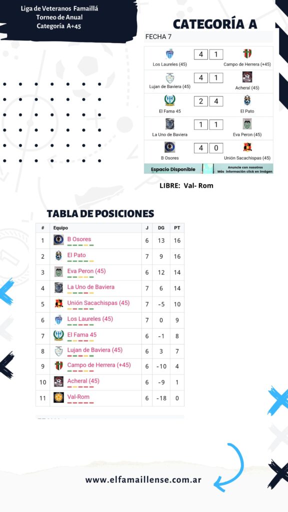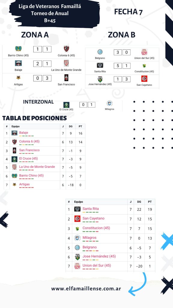 Este sábado se disputó la séptima fecha de los torneos anuales para categorías mayores de 45 años organizados por la Liga de Veteranos de Famaillá, con encuentros emocionantes tanto en la Categoría A como en la Categoría B.