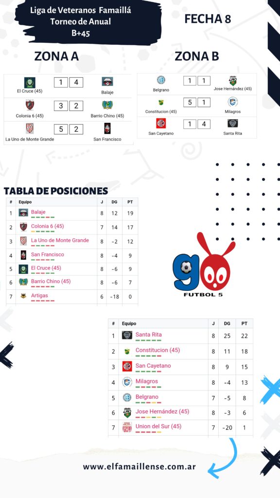 Este sábado se disputó la octava jornada del Torneo Anual de Veteranos de Famaillá para las categorías mayores de 45 años, con partidos vibrantes en ambas divisiones. A continuación, repasamos los resultados y cómo quedaron las tablas en cada zona.