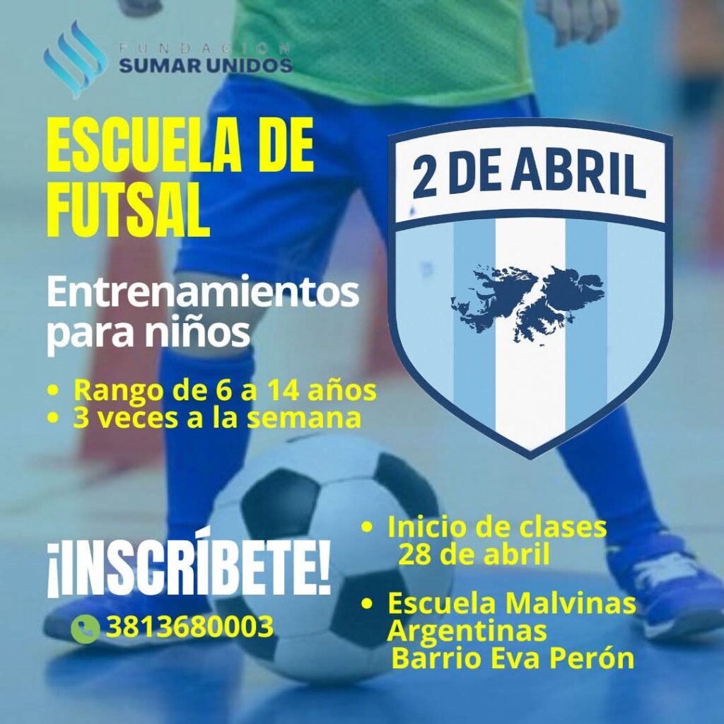 La Escuela de Futsal “2 de Abril” abre sus inscripciones para este espacio de formación deportiva, integración y crecimiento. Las clases para niños y jóvenes se llevarán a cabo en la Escuela Especial Malvinas Argentinas, con entrenamientos los lunes, miércoles y viernes a partir de las 18:30 hs.