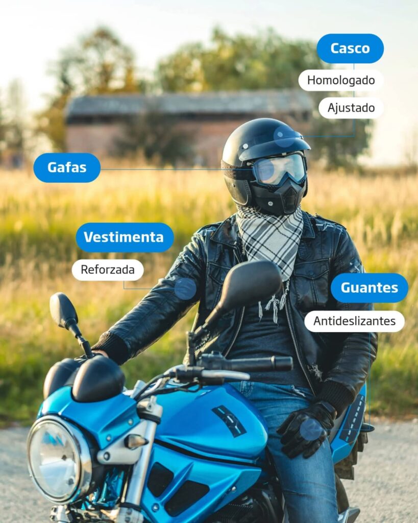 El casco homologado es la pieza fundamental: debe cubrir toda la cabeza, estar bien ajustado y contar con visera. Para la vista, lo ideal es utilizar gafas específicas para moto o un casco con visera cerrada, que proteja de insectos, viento y polvo.