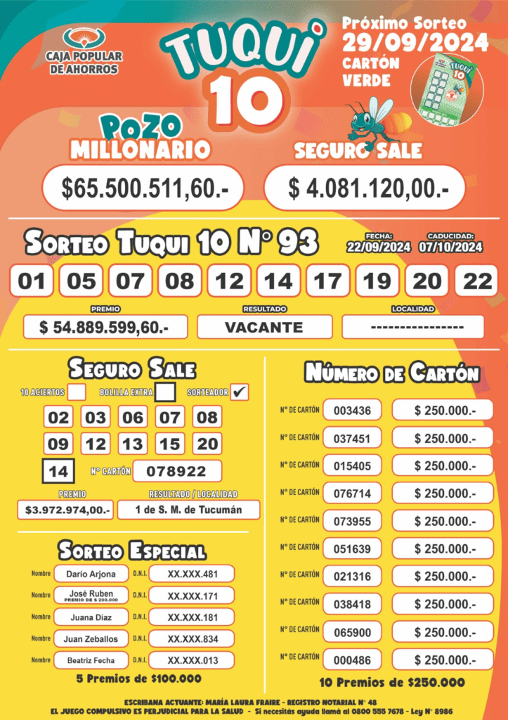 Este domingo 22 de septiembre se realizó el sorteo 93° del Tuqui 10 y el primer premio quedó vacante. Ningún tucumano o tucumana es el ganador de los $ 54,8 millones que estaban en juego, y el pozo millonario sigue creciendo.