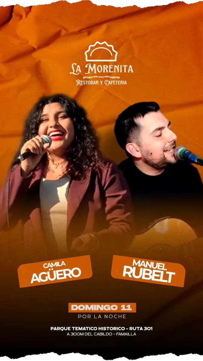 El domingo la agenda continuará con folklore. Al mediodía se presentará Javier Tula, acompañando el almuerzo, mientras que por la noche el escenario recibirá a Camila Agüero y Manuel Rubelt, en un cierre musical para toda la familia.