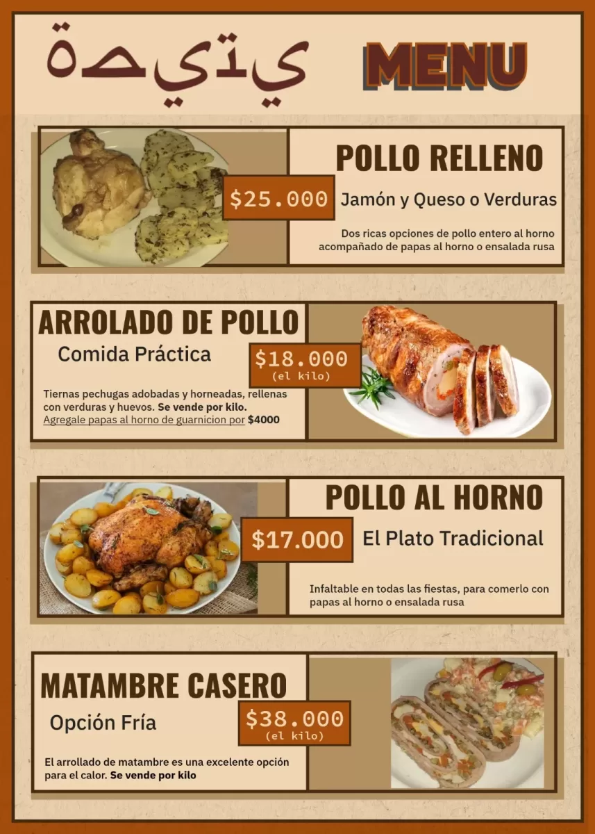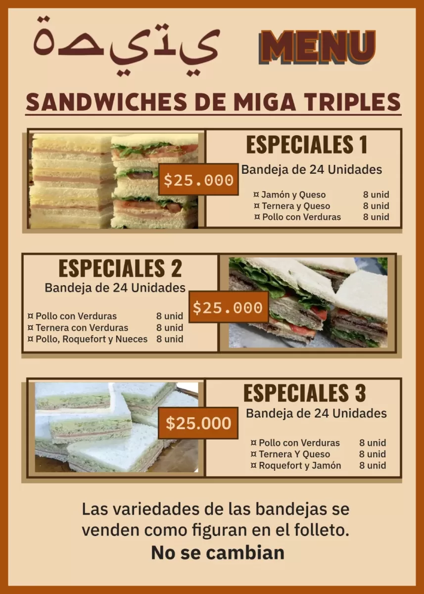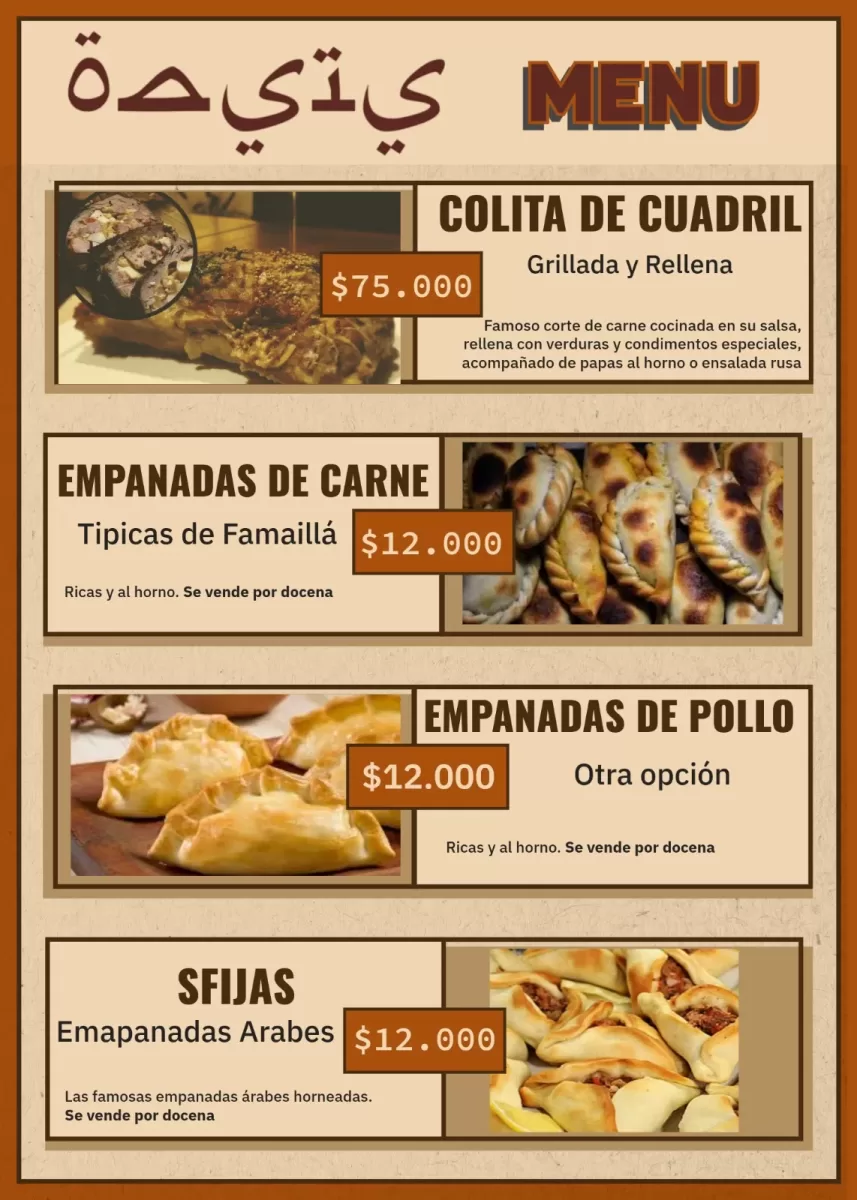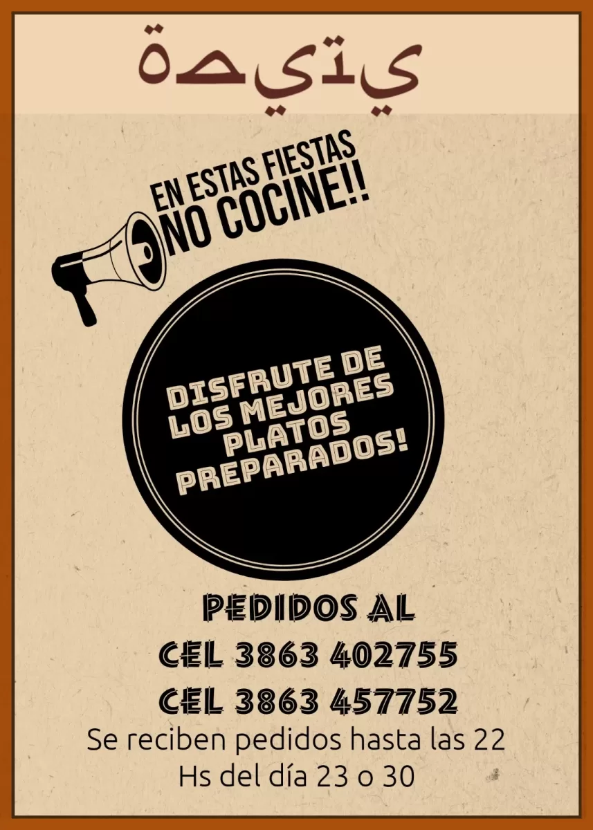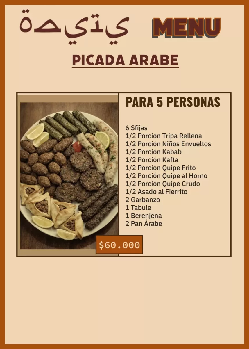 Oasis se presenta como una de las opciones más elegidas por su variedad de platos preparados, ideales para reuniones familiares, cenas especiales o encuentros con amigos.La propuesta incluye desde platos tradicionales hasta especialidades árabes, con menús pensados para distintos gustos y cantidades de comensales.