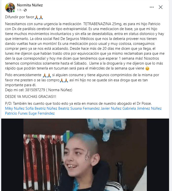 “Es una medicación de base, ya que mi hijo tiene muchos movimientos involuntarios y sin ella se desestabiliza, entra en status distónico y hay que internarlo”, expresa Norma, la mamá del niño, en un posteo publicado en las redes sociales.