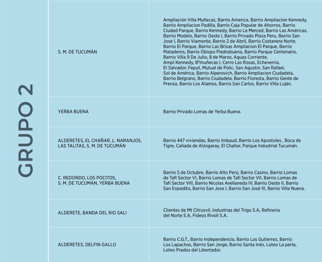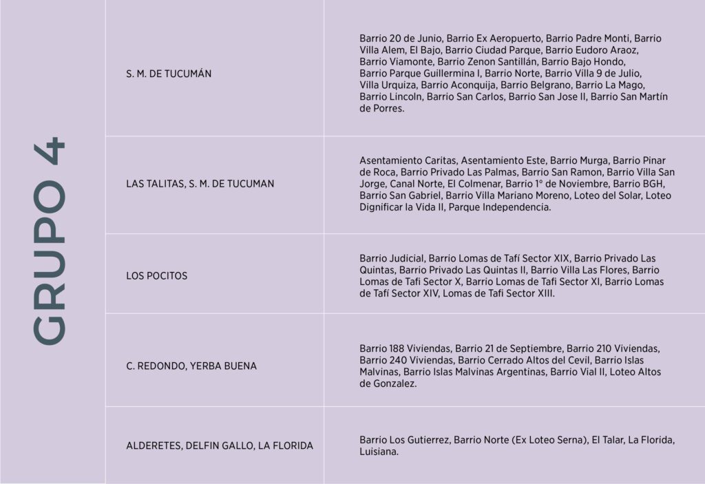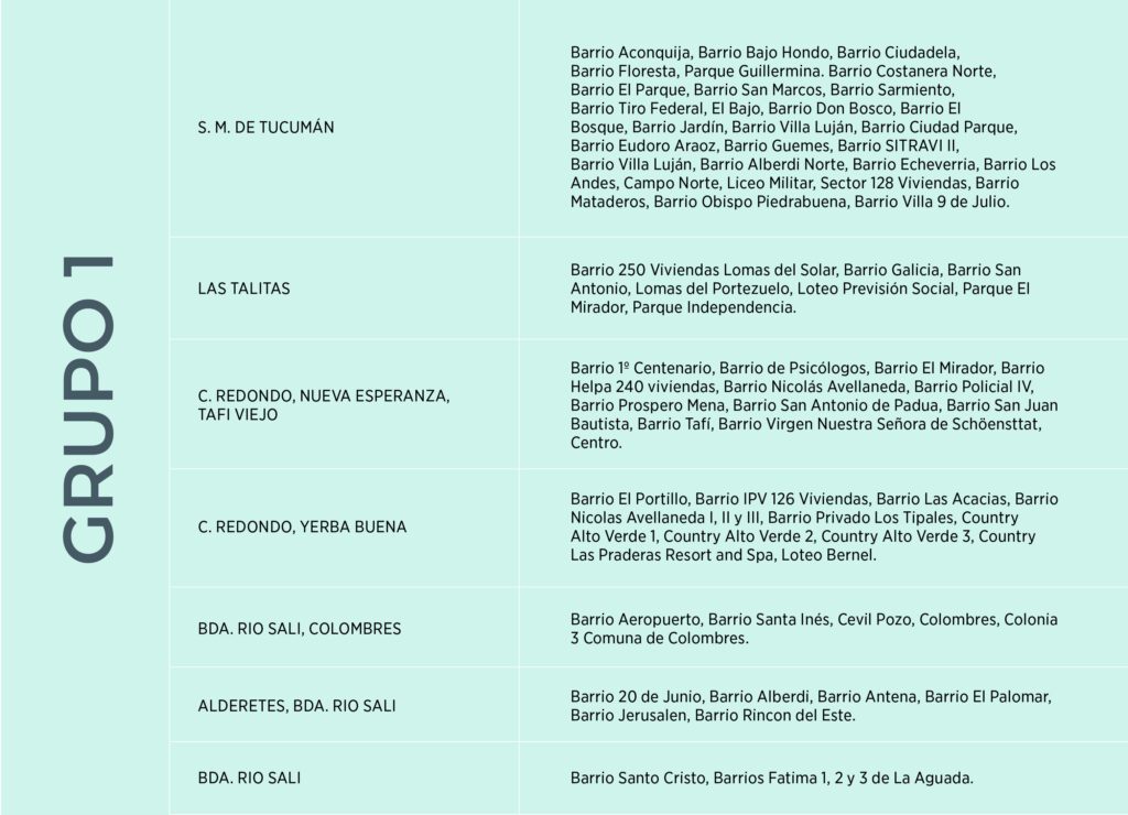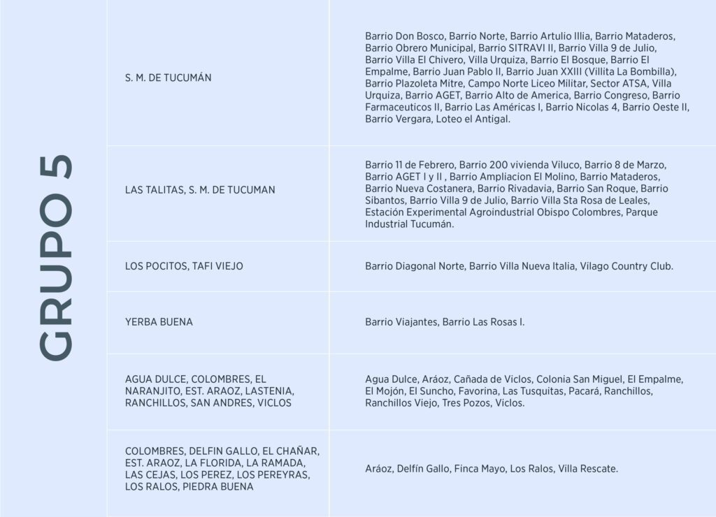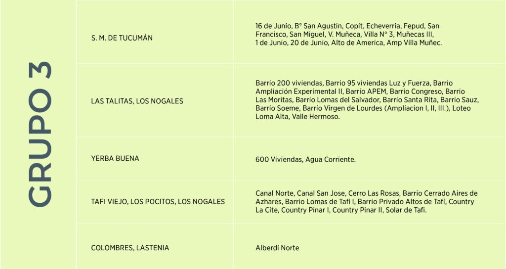 Los grupos comprenden al Gran San Miguel de Tucumán, Tafí Viejo, Alderetes y alrededores.