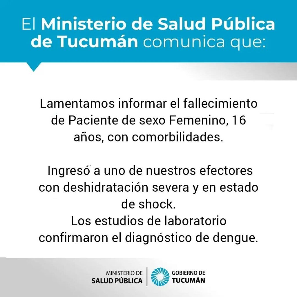 Se trata del primer fallecimiento por dengue en lo que va del año en la provincia de Tucuman. El breve comunicado señala que la joven padecía de comorbilidades. La confirmación llegó de la mano del anuncio de ministro sobre la suma de casos en la provincia que ya supera los 2700.