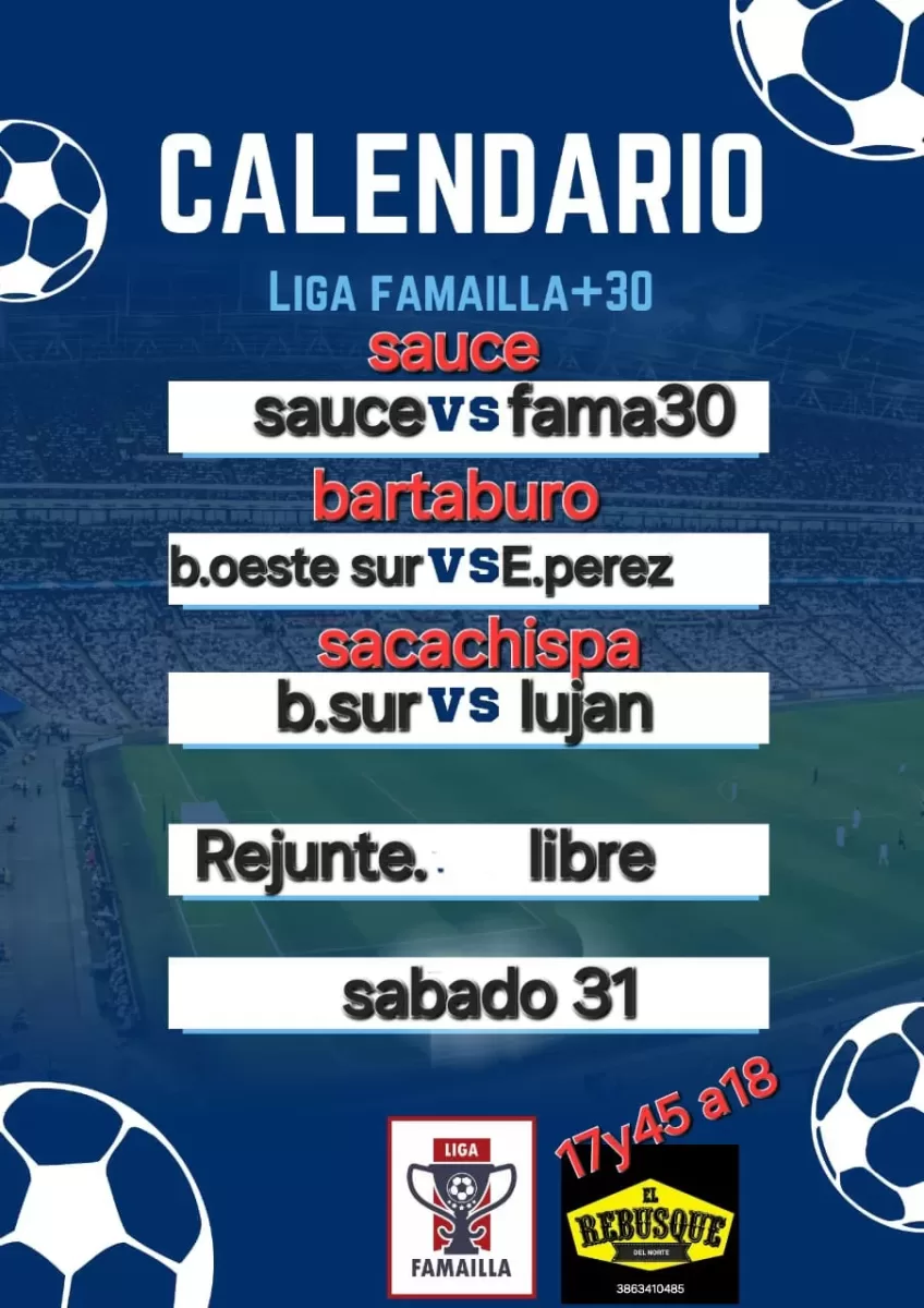 En la cancha de Sauce, el conjunto local de Sauce se medirá ante Fama 30. Por otro lado, en Bartaburo, Barrio Oeste Sur enfrentará a Elías Pérez, mientras que en Sacachispa se disputará el encuentro entre Barrio Sur y Luján. Todos los partidos están programados para iniciar en el bloque horario de las 17:45.