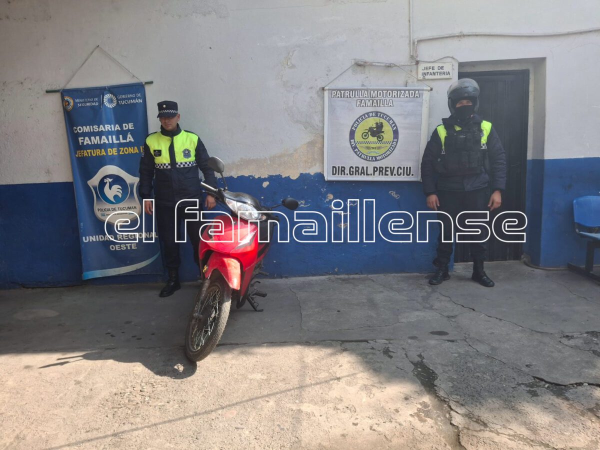 Efectivos de la Patrulla Motorizada de Famaillá aprehendieron este domingo a dos jóvenes y secuestraron una motocicleta, en el marco de un operativo preventivo realizado en el barrio 120 Viviendas.