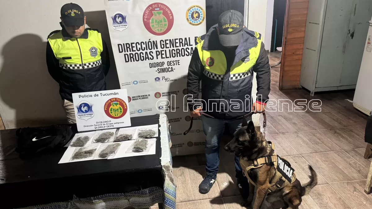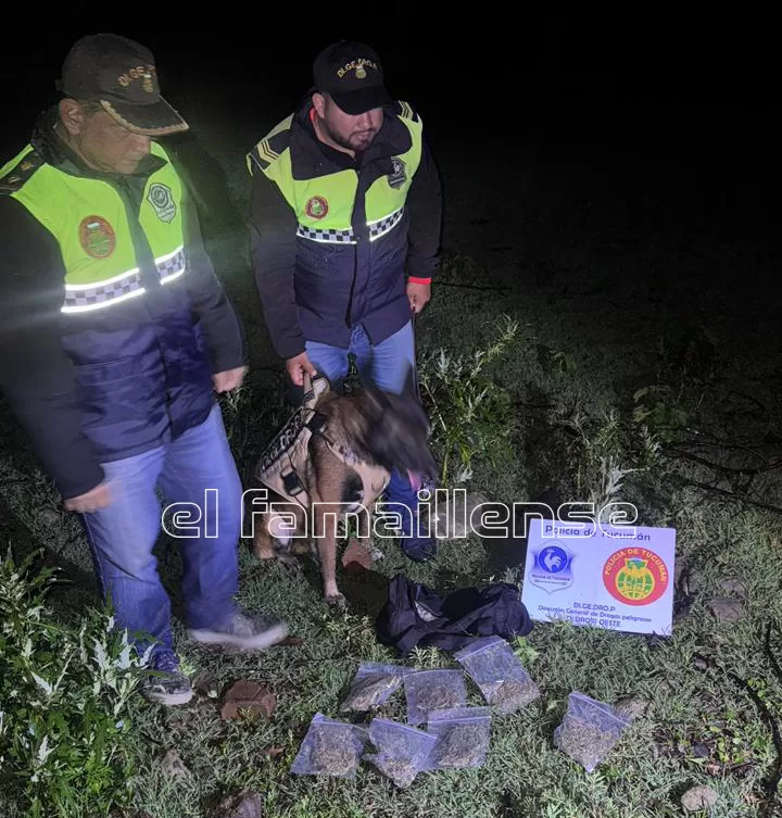 Tras el hallazgo del elemento descartado, se solicitó la intervención del can “Lebrón”, el cual realizó un rastrillaje en la zona y emitió una “alarma orientativa”, confirmando la posible presencia de sustancias prohibidas. Al inspeccionar el bolso en presencia de testigos, los efectivos constataron la presencia de varias bolsas selladas con sustancia vegetal, la cual fue sometida a las pruebas de campo correspondientes.