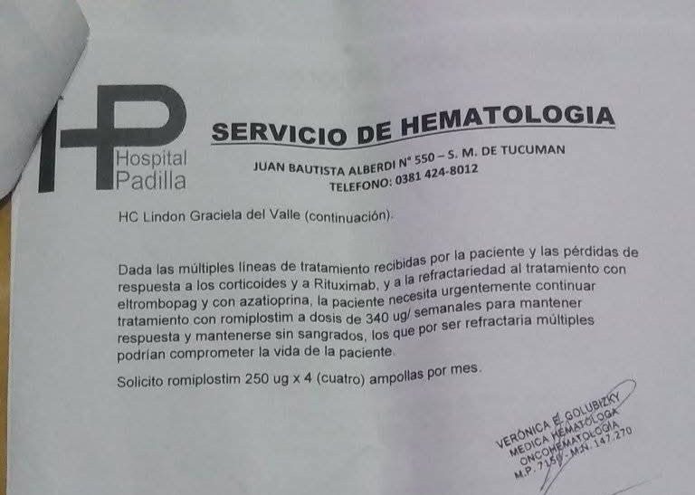 La monteriza Graciela Lindon, necesita del Romiplostin para poder contrarrestar su enfermedad pero una vez más se encuentra sin repuesta desde la obra social.