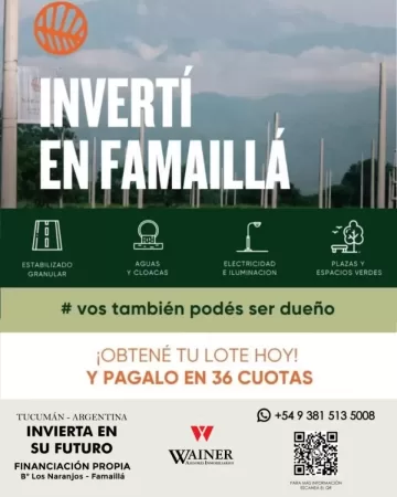 A través de Wainer Inmobiliario, podés acceder a estos beneficios con una financiación de hasta 36 cuotas, haciendo realidad el sueño del terreno propio. Los interesados pueden recorrer el predio junto al asesor Silvio Herrera (Telefono : 3815135008) para experimentar personalmente la serenidad que ofrece este rincón de Famaillá.